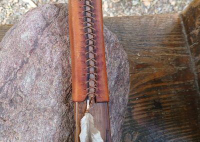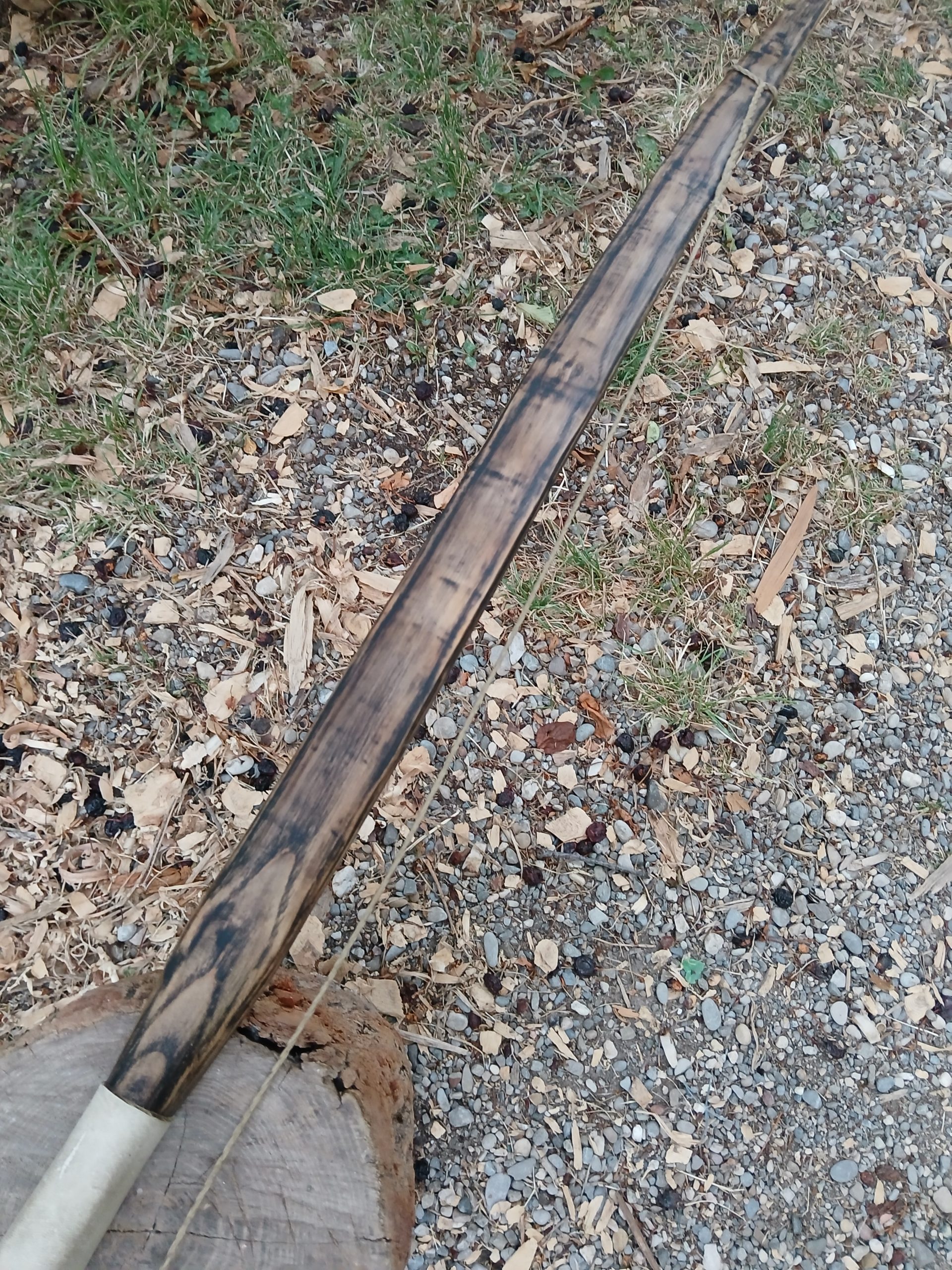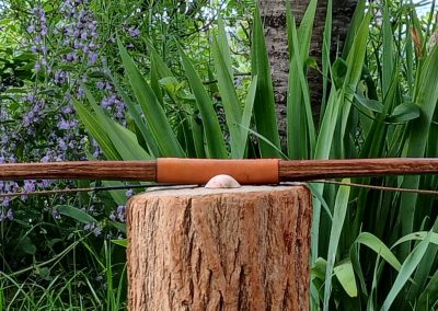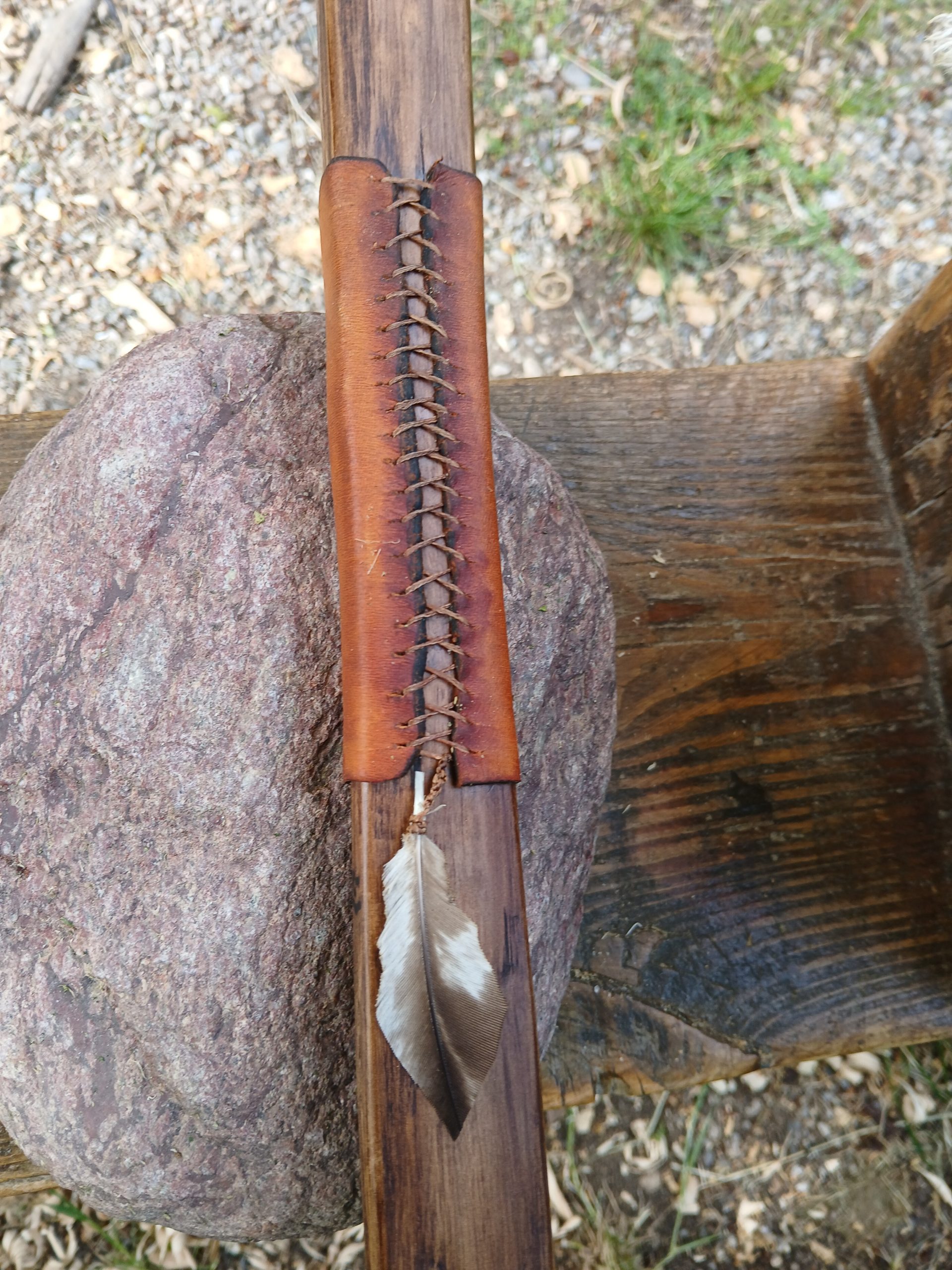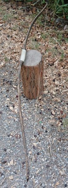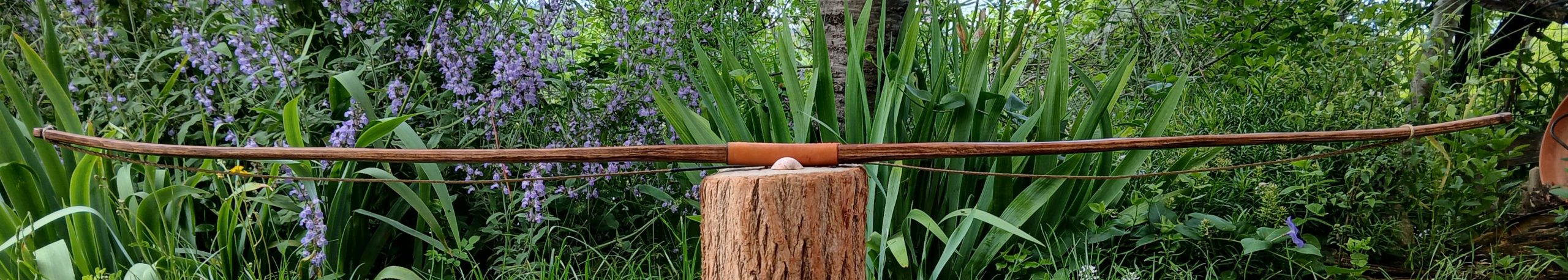 Plus complexe à élaborer les flats bows à poignées cintrées, épaisse et rigide donne plus de confort lors du tir. Il mesure 64 » de long et 1″3/4 de large. il pèse 52# à 28″ d’allonge. Sa teinte foncé et nuancé et obtenue avec des oxydes de manganèse fixée à la colle de peau. La protection est entièrement naturelle. Elle peut cependant être remplacé par un vernis moderne selon la demande. Un arc de chasse, résistant et silencieux.