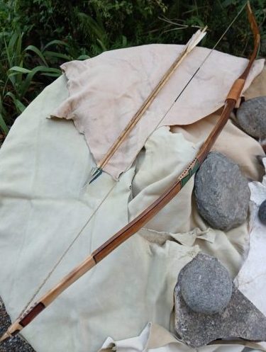 Cette arc est similaire au Chasséen sombre monochrome. Le plus reflex de la série. De petites lamelles de corne de mouflon définissent les extrémités de l’arc. Les décors sont des pigments naturels protégés de vernis de qualité. La poignée est en buck skin couleur bronze, La corde est en Dacron B55. 64 » de long 1 » 3/4 de large, 43# à 28 ». Un arc court et rapide. 820.00€